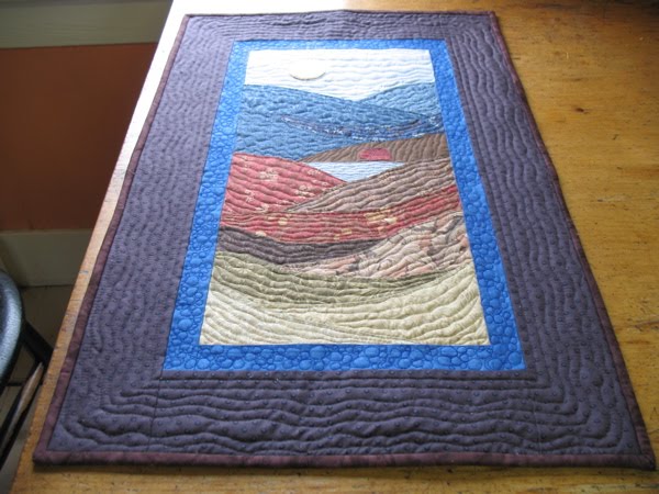 Back Road Quilters had Jo Diggs come to a recent meeting. She did a lecture/slide show/trunk show with many of her wonderful landscapes. I was inspired to make this piece. It measures 16x26 inches. Hand appliqued. Machine quilted.