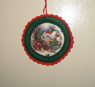 | "Chessie" Here's a Christmas ornament I made recently. The embroidery pattern comes from an old Erica Wilson book from the library. Amazon has used copies for sale, wow you really can find everything on the internet. Embroidered with cotton floss on a delicate polka dot fabric. Felt frame and backing. I machine embroidered the felt to the red backing and then used a wavy blade in a rotary cutter to finish the edge. |